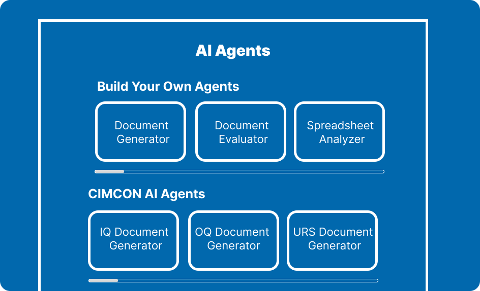 - CIMCON's AI Agents generate your URS, IQ/OQ/PQ protocols, Requirements Traceability Matrices, and compliance gap assessments from your existing system documentation — then our validation experts provide human-in-the-loop review and sign-off